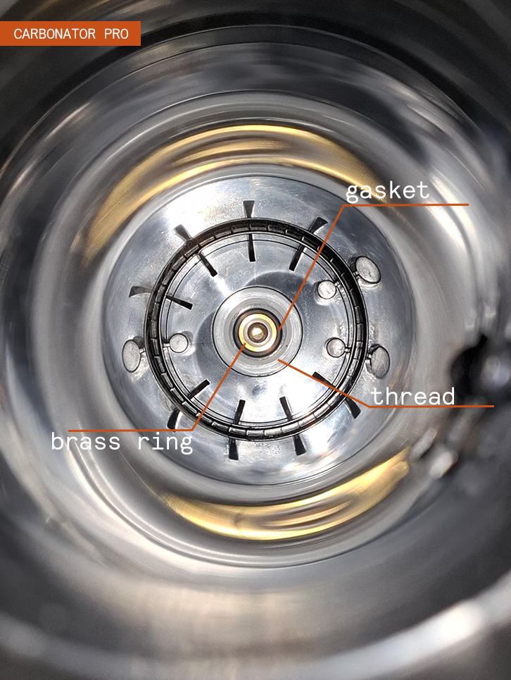 The gas-block gasket is a small, round, black, rubber seal, often called o-ring, washer or rubber. It is located around the brass ring, in the compartment where the CO2 cylinder is screwed in and is a crucial part of the Carbonator Pro and I-III. When the gasket is missing or damaged, the machine will not produce sufficient carbonation, and it can also cause the cylinder to lose all the CO2.